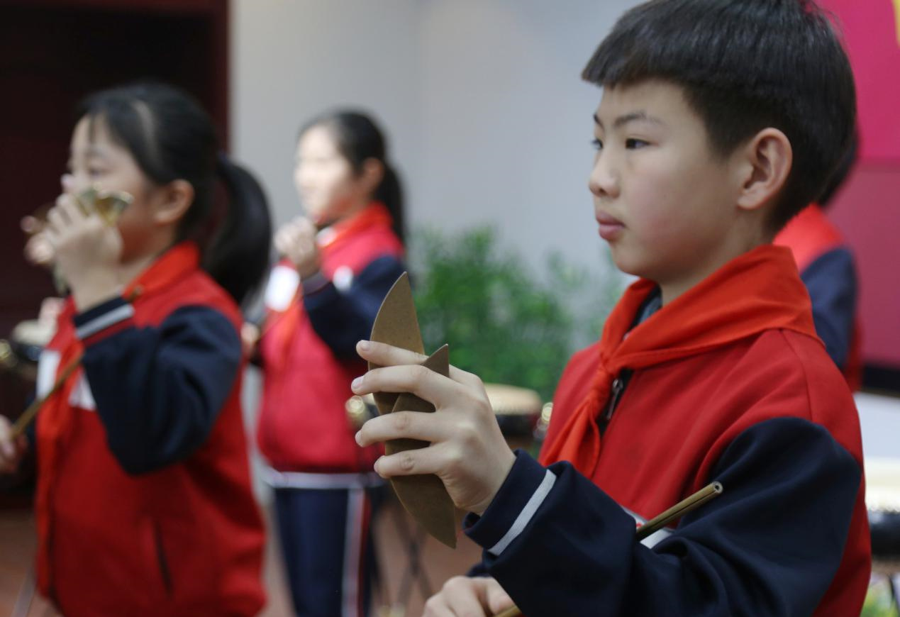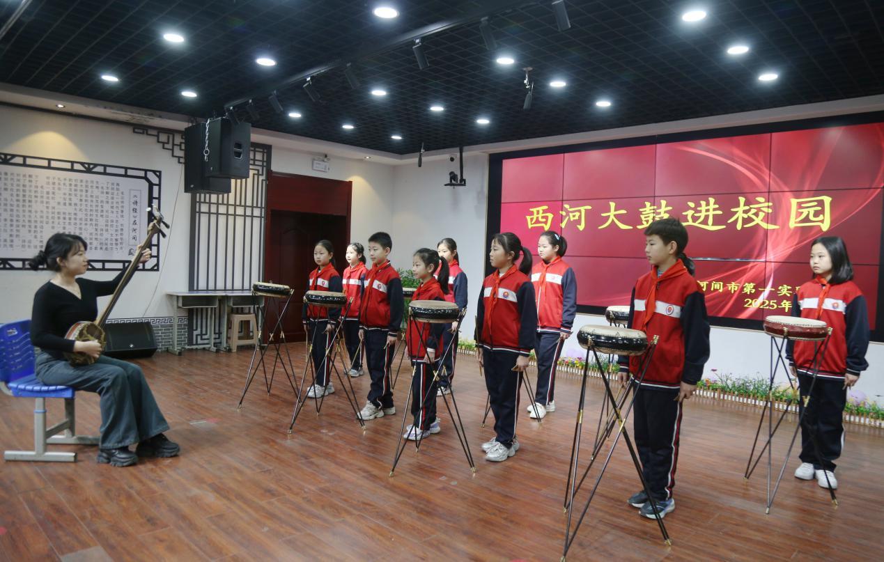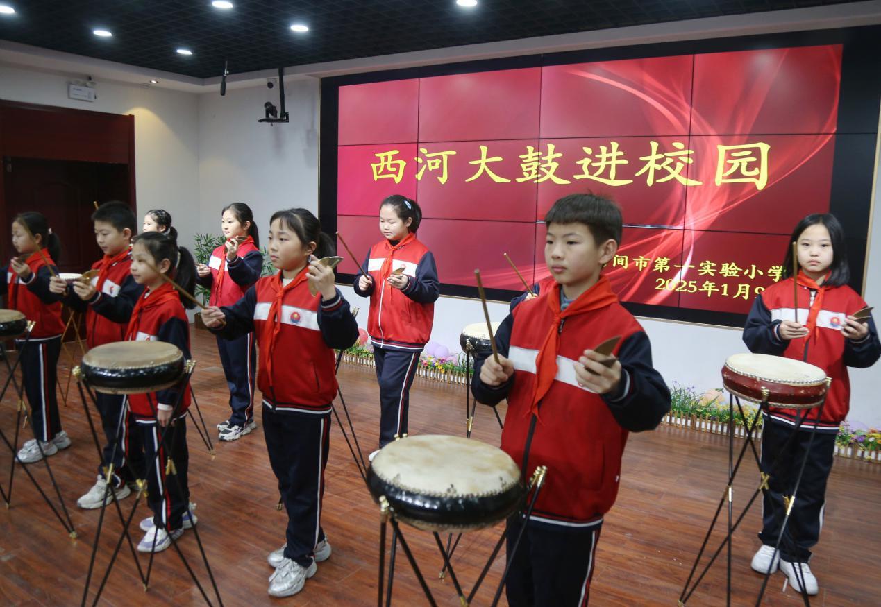 1月9日,在河北省河间市第一实验小学,一场西河大鼓现场教学让学生们近距离体验传统曲艺艺术。曲艺艺人示范指导打板、打鼓和手势、眼神、站姿、唱腔等,学生们一招一式认真学习。